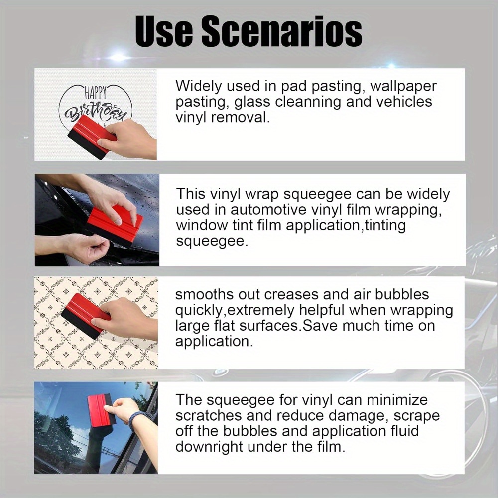 4. Multifunctional: Suitable for vehicle wrapping, window tinting, and various DIY tasks. 5. Economical: Prevent expensive errors and attain a perfect result with this comprehensive kit. Specifications: Material: Plastic/Rubber/Stainless Steel Mounting Method: Peel And Stick. 10 PCS Vinyl Wrap Accessories Package contains: 1 x Red Vinyl Felt Squeegee 1 x Red Vinyl Squeegee Stick 1 x Craft Knife 5 x Blades 1 x Safety Cap 1 x Black Fabric Felt